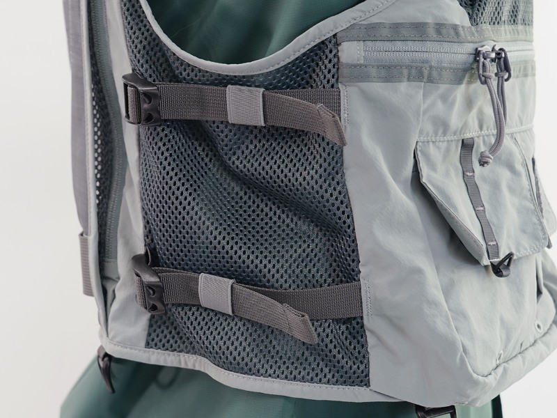 | その他の特徴 | ・胸ポケット内に糸くず取りベルクロ ・ピンオンリール用タブ ・裾前後のDカンなど | ・変更可能な3WAYスタイル ・ポケットやDカンテープは取り外し式で、デイジーチェーン上の好みの位置に付け替え可能 ・バックパック側面のCORDURA生地採用で強度と軽量性を両立 |