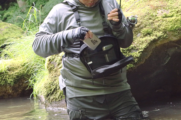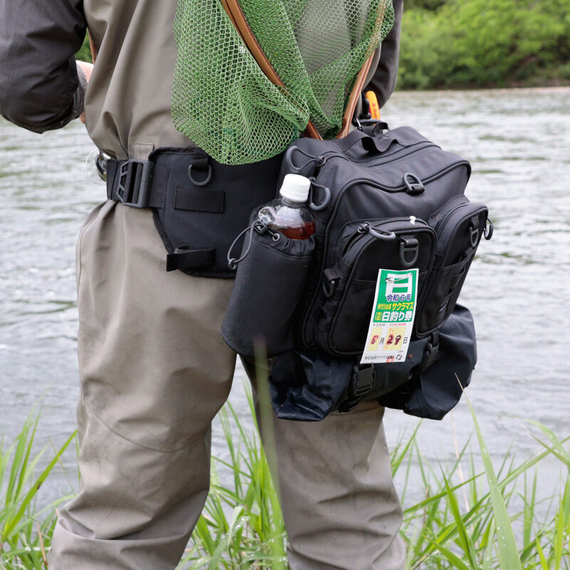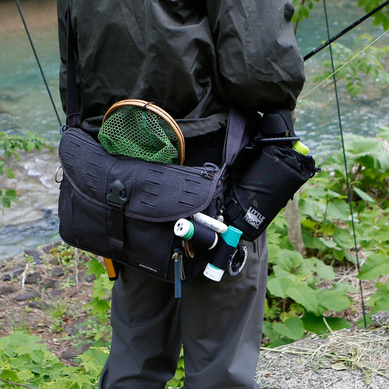 渓流釣りでは、渓流ベストを着用せず「渓流バッグ」を装着するスタイルも人気です。