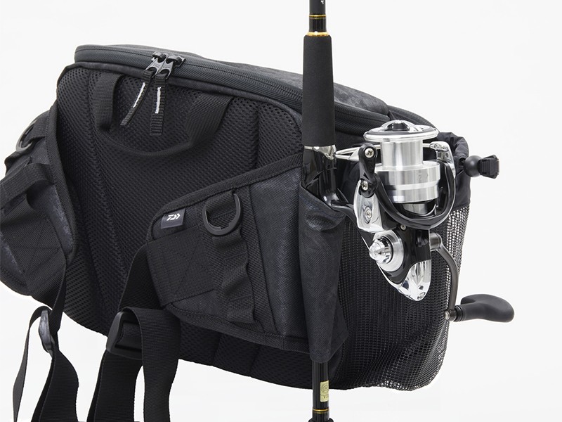 両サイドには、ロッドケースを装着すべく2つのバンドとメッシュポケットを配置。