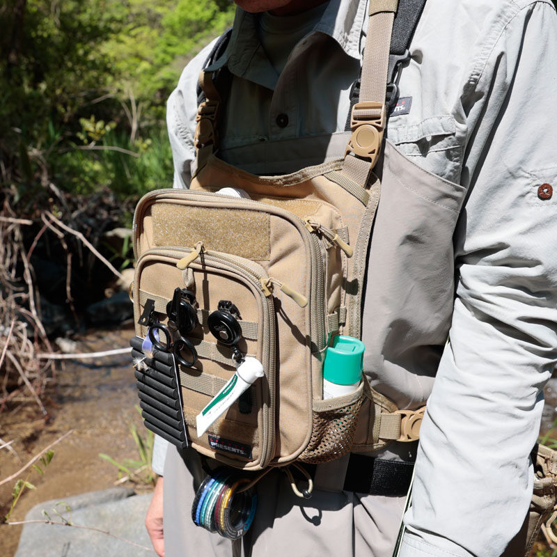 チェストバッグは、胸元にバッグ部分があるタイプで、ルアーやフライをサッと交換しやすいのがメリットです。頻繁にルアーをローテーションしたい方に向いています。