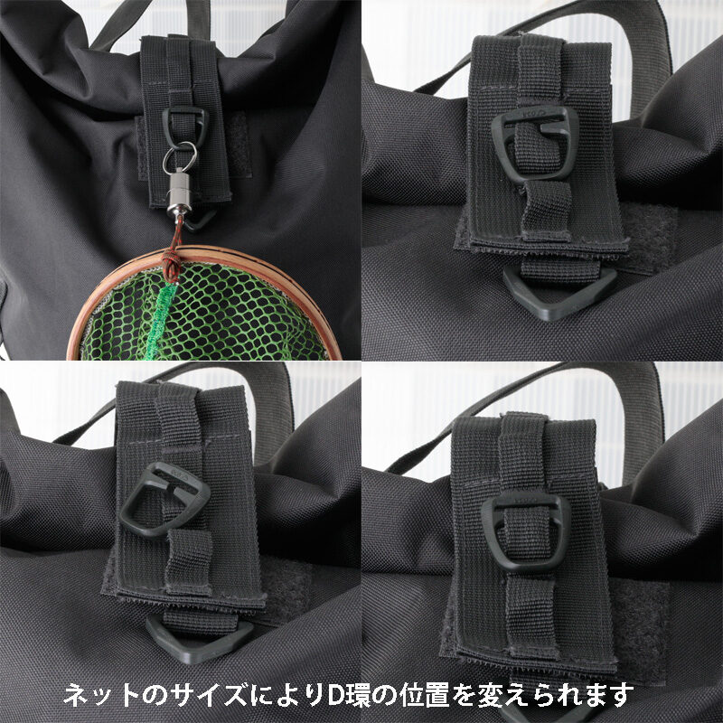 背中に設けた2箇所のD環には、ランディングネットをセット可能。