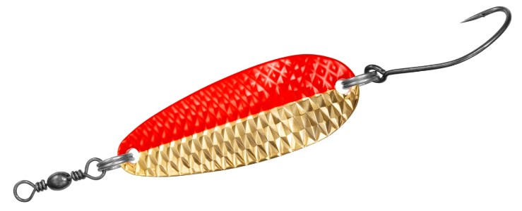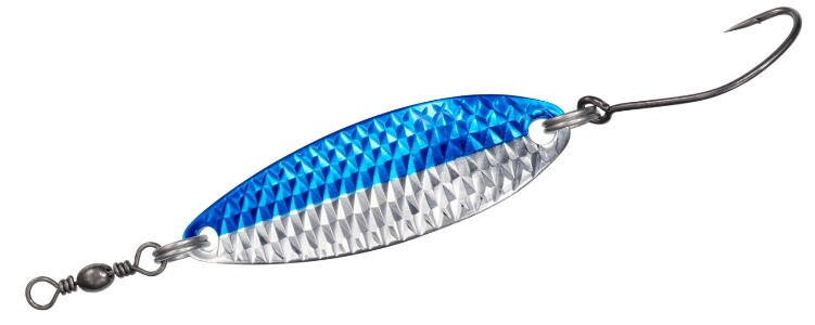 ミノーともスプーンとも異なる、独特なフォルムが特徴で、流れのなかを引いてくるとブレードが水の抵抗を受けて回転します。